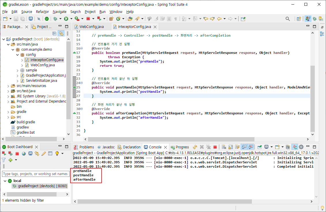 - 샘플URL(http://localhost:8080/sample/dashboard) 호출 후 인터셉터가 순차적으로 잘 타는지 확인
