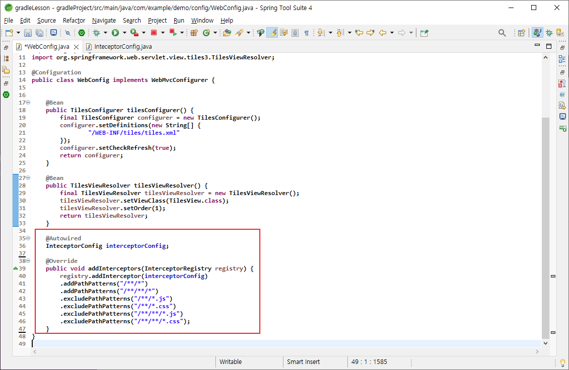 2. WebConfig.java 의 addInterceptors 메소드에 인터셉터 설정 추가